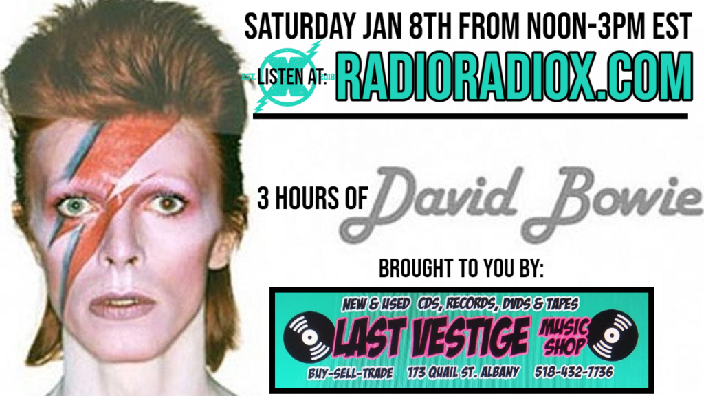 Tune in Saturday January 8th for 3 hours of David Bowie on RadioradioX.com from Noon- 3pm eastern. Let’s celebrate what would have been David’s 75th birthday. Sponsored by Last Vestige Music Shop