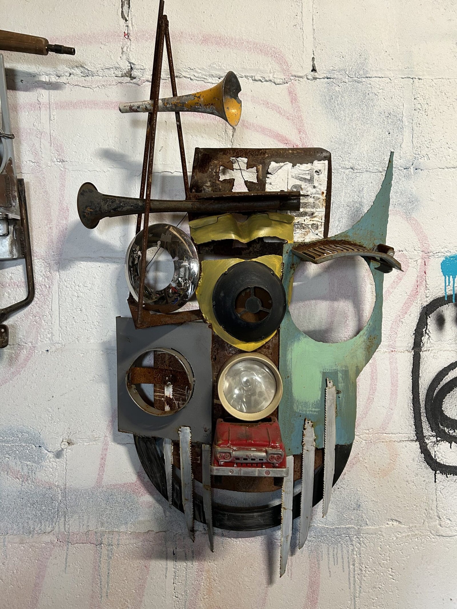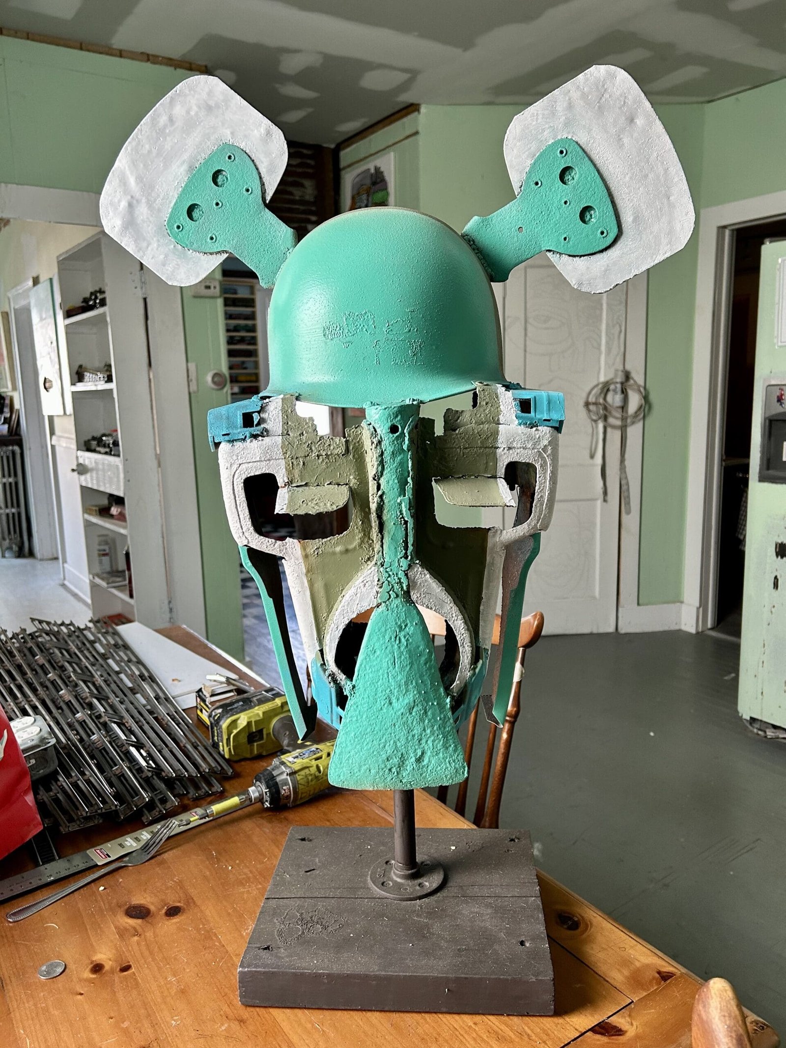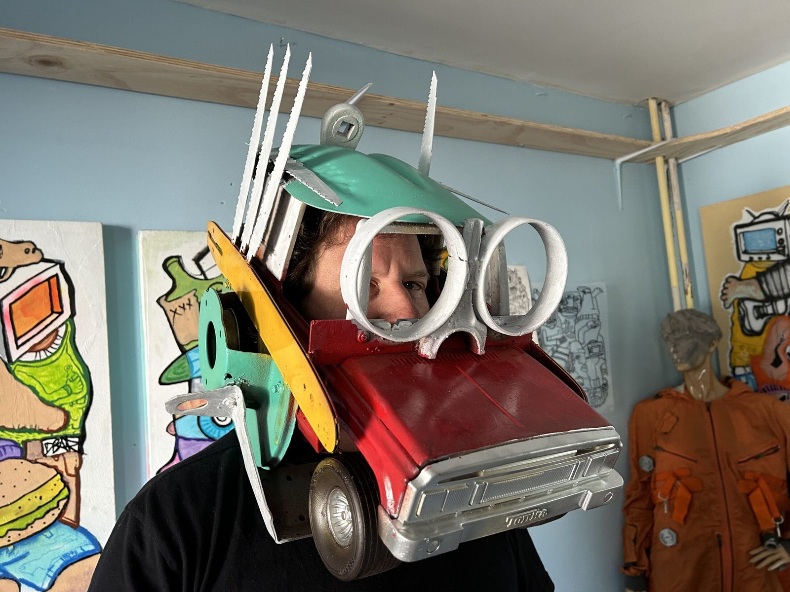 He started making the wall sculptures and helmets just before COVID started. “I was like, what would you wear if you had to go into battle and scare your enemy? Part of this stuff is like an old truck that I found. I cut it in half. I opened up the doors for the eyelids. It’s made it a different truck parts. Tonka toy trucks. Parts of army helmets. A fan off a flywheel that went to some big truck. And I try to make it all functional so you can actually wear it. It’s a little uncomfortable because it’s a little rough on the inside. To join it all together I’ll use welding. Sometimes if it’s a soft metal, like galvanized, I’ll use a drill or rivets.”