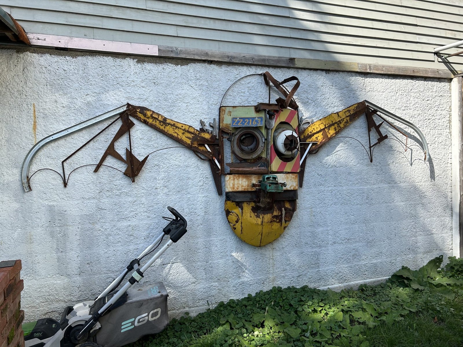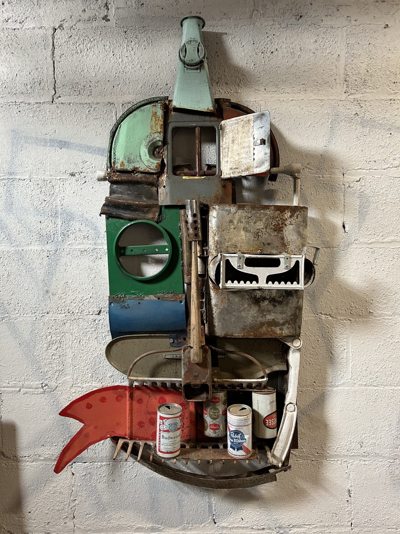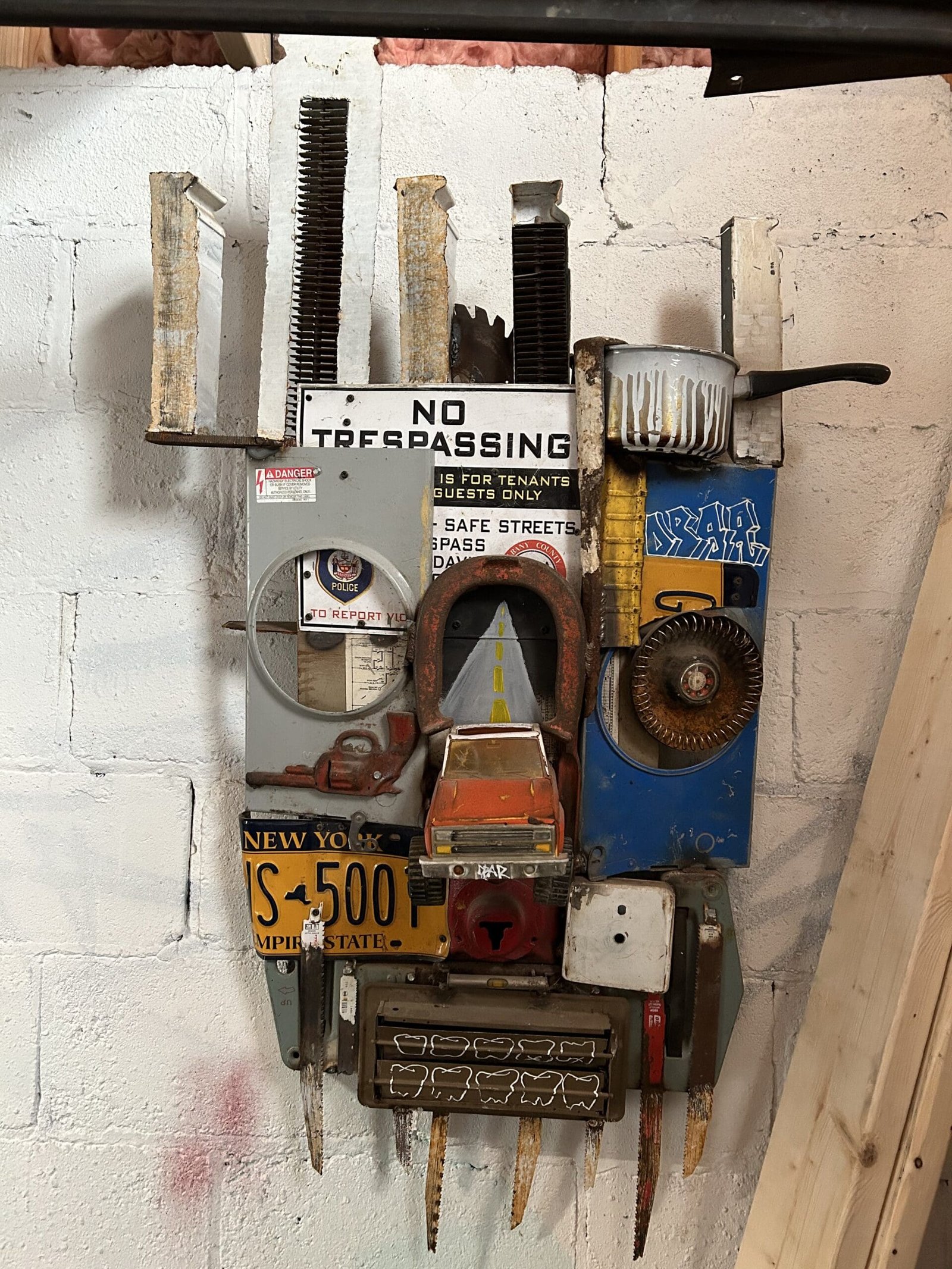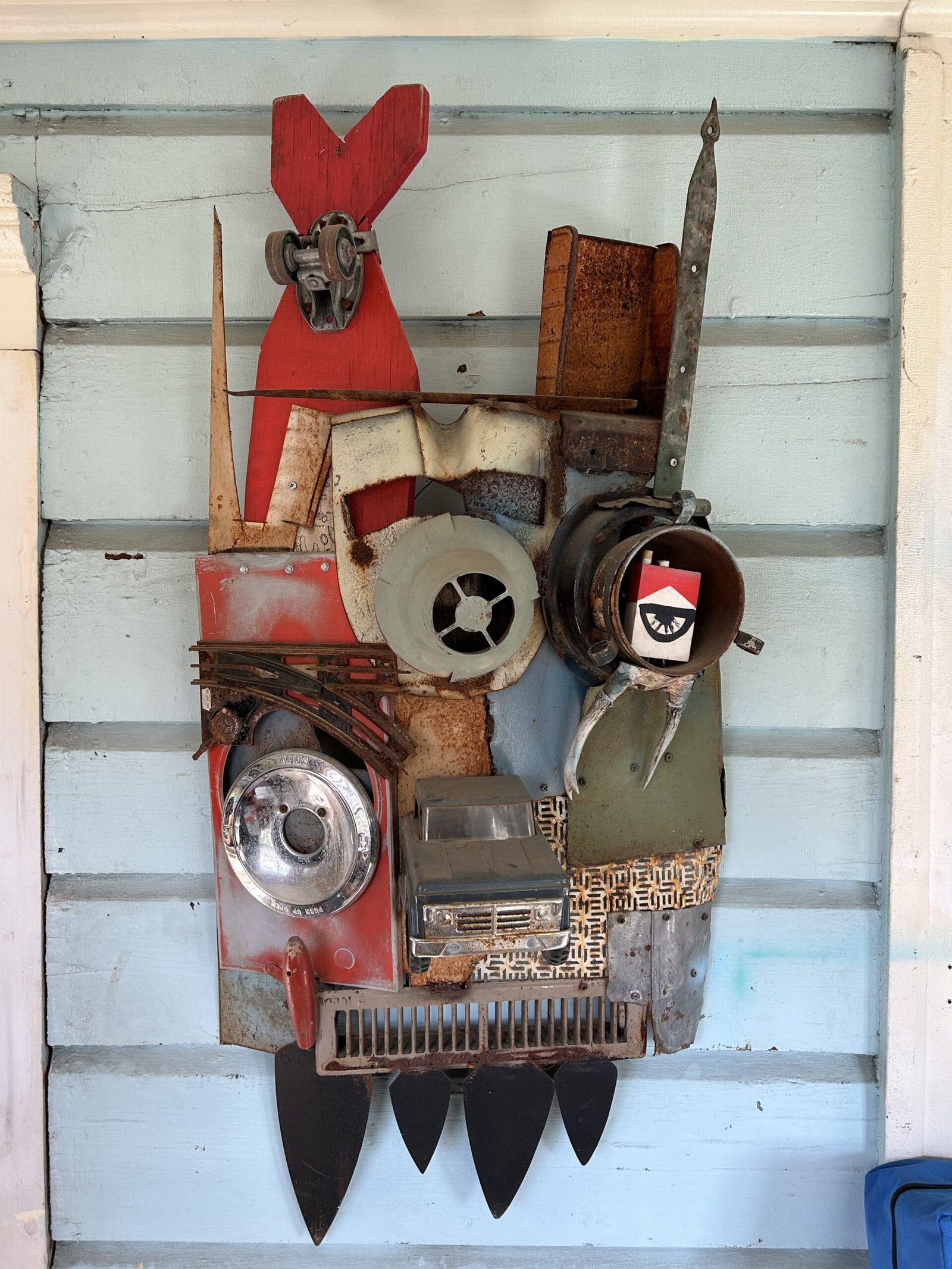He started making the wall sculptures and helmets just before COVID started. “I was like, what would you wear if you had to go into battle and scare your enemy? Part of this stuff is like an old truck that I found. I cut it in half. I opened up the doors for the eyelids. It’s made it a different truck parts. Tonka toy trucks. Parts of army helmets. A fan off a flywheel that went to some big truck. And I try to make it all functional so you can actually wear it. It’s a little uncomfortable because it’s a little rough on the inside. To join it all together I’ll use welding. Sometimes if it’s a soft metal, like galvanized, I’ll use a drill or rivets.”