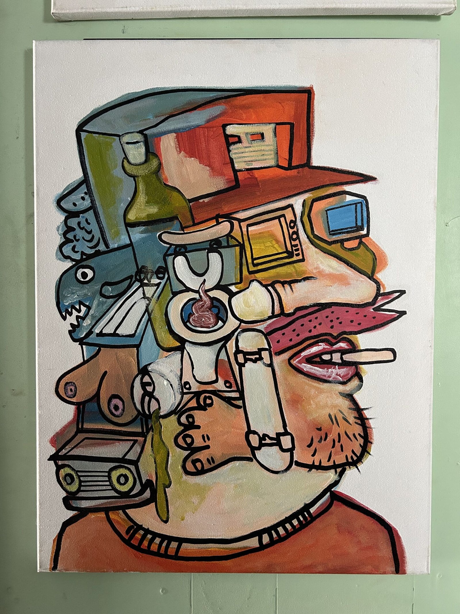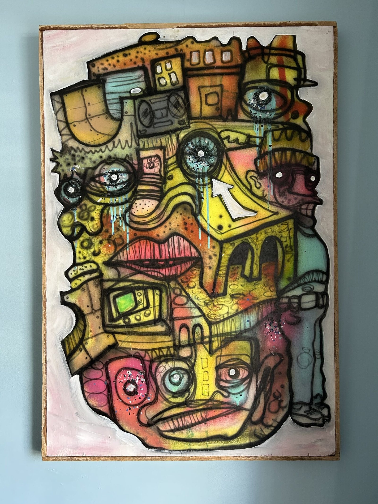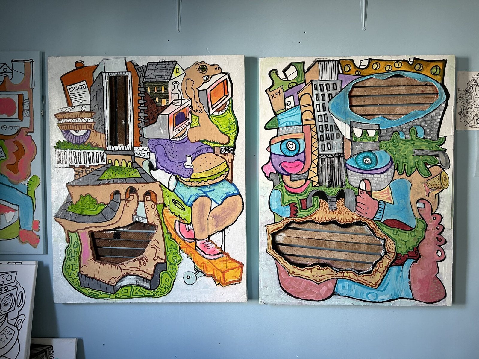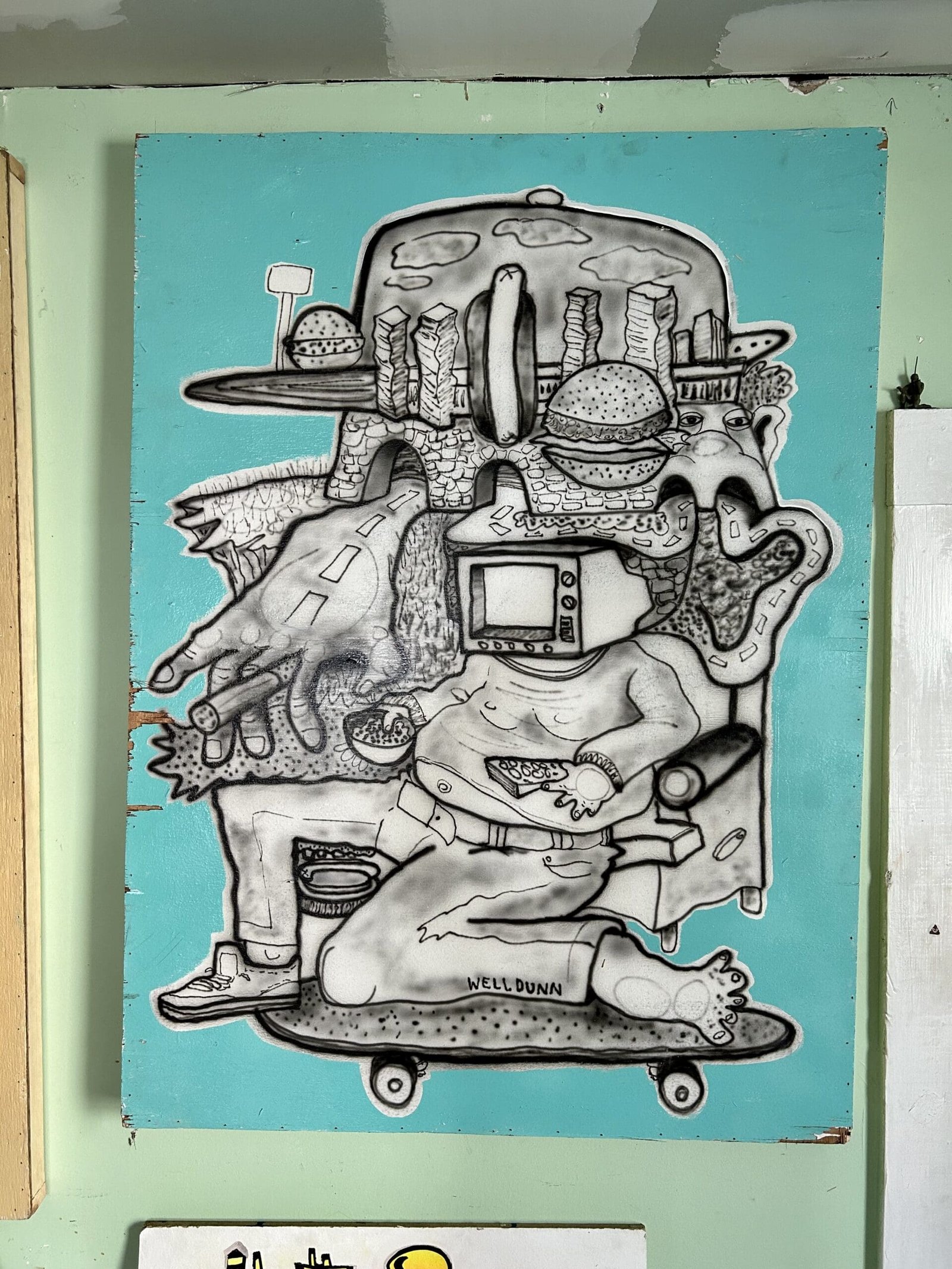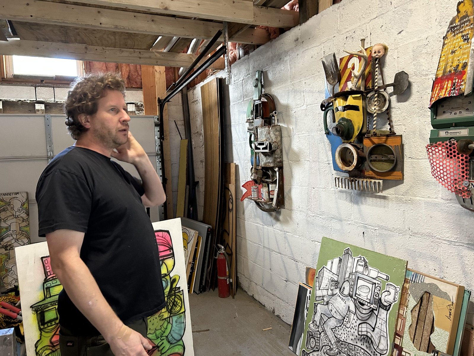 Max Dunn is reclaiming a house in North Albany the same way he reclaims materials for his artwork; by using things he’s found, things he’s repurposing and things he’s improving. Working in construction, he finds a lot of his materials on job sites and in old buildings. “Throughout the day I’ll find materials that are going be thrown out. Junk, old parts. Anything that’s nice and smooth to paint on. A lot of this is old weathered Luan and it’s starting to just kind of fall apart. And it kinda adds to that feel like someone would nail it up on the street. And it would eventually just deteriorate. That’s what I like. Stuff like that.”