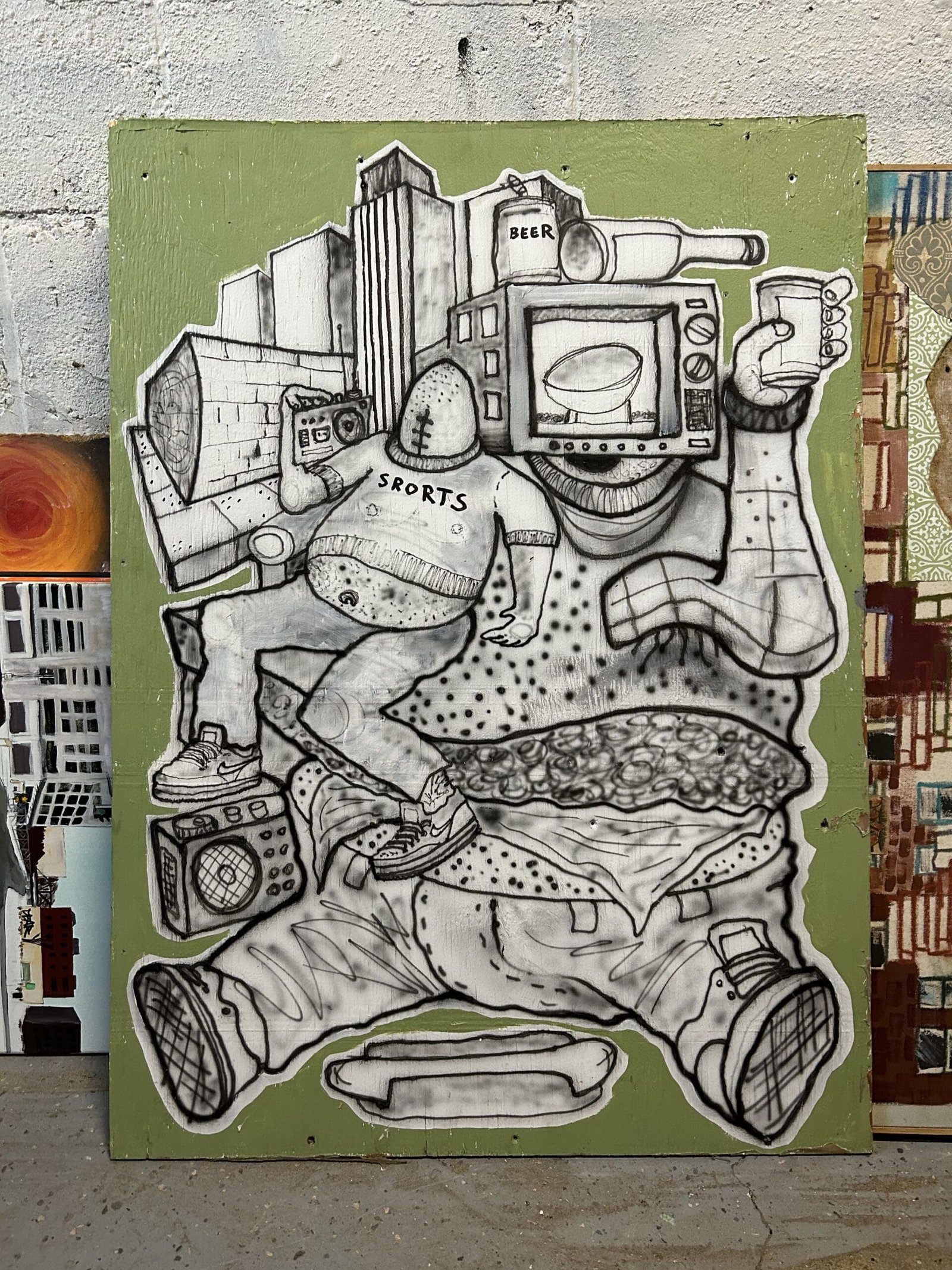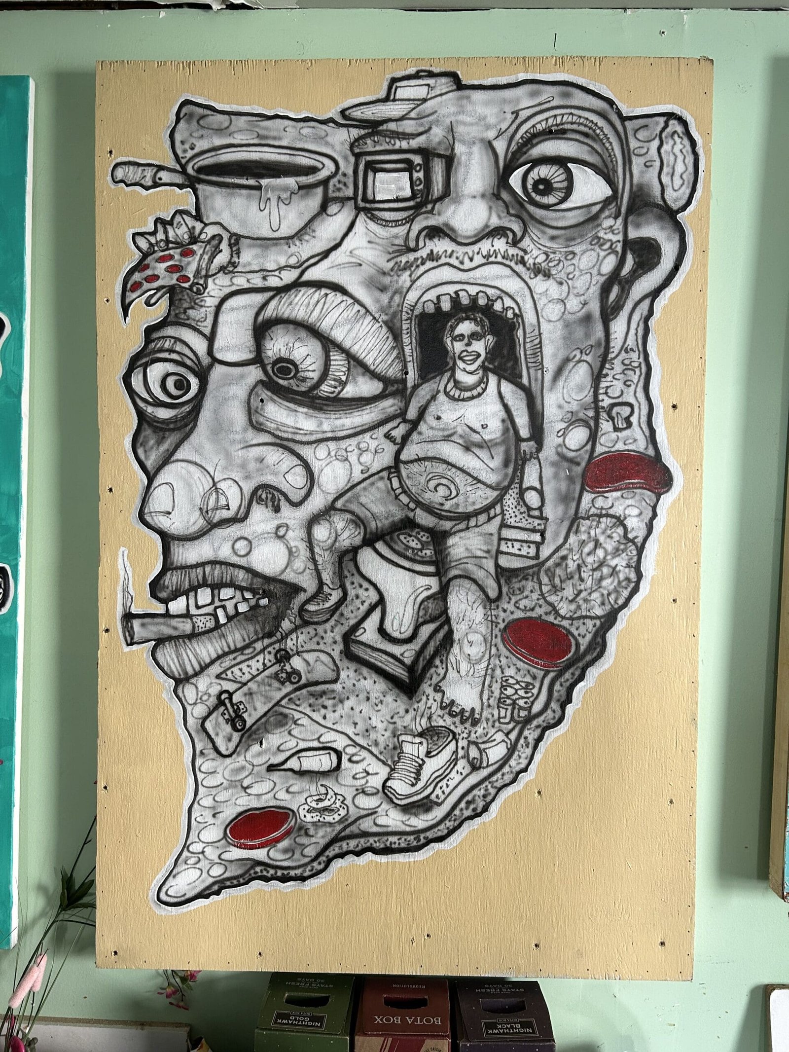 Entirely self-taught in art, Max sites hobo culture as an influence. “Artists create their own environment, how they want to live, what kind of world they want to be in. And I was always kind of inspired by kind of hobo life, homeless people. People that kind of had it with the world. Had it with paying all this money to live in a box. And they could probably just go in a dumpster, find a cardboard box and make a fort out of that or something.”