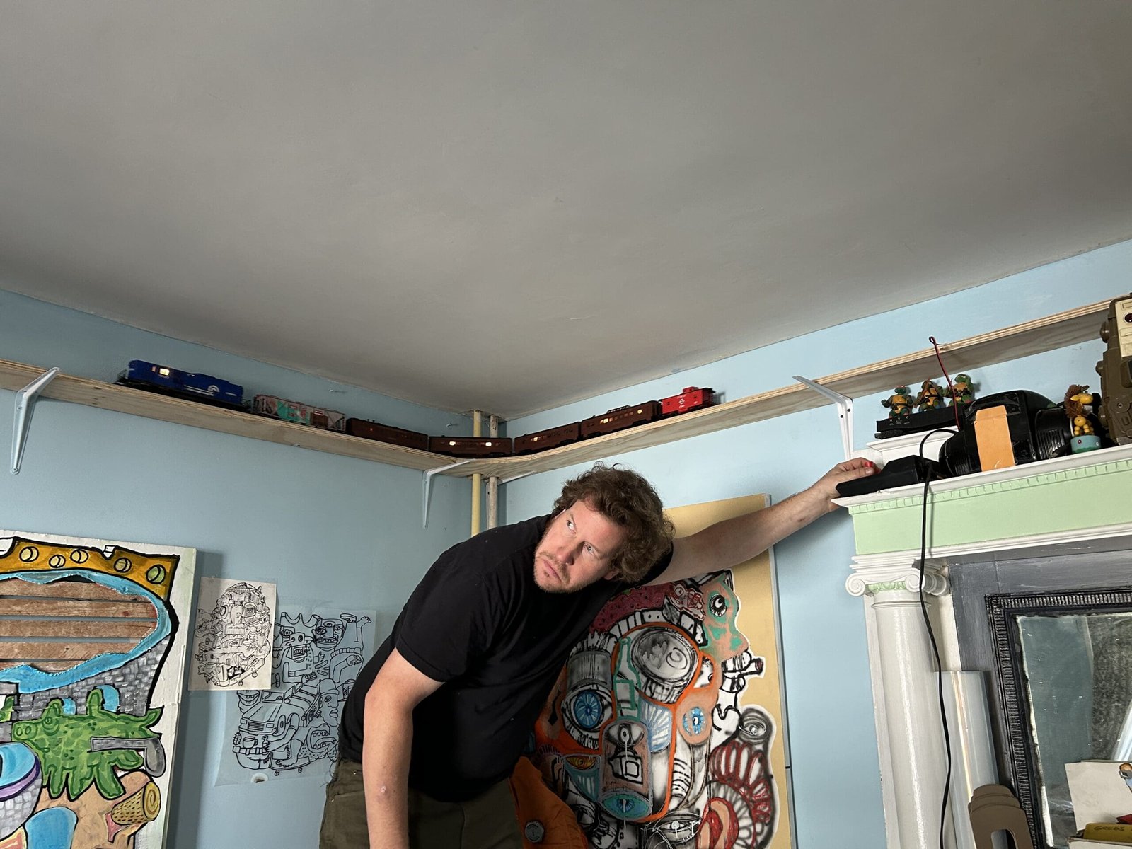 Every room in his house is hung and stacked with large paintings in various stages of completion. Circling above them in his living room is a beautiful HO scale train set he’s rescued. He’s built a series of shelves for the track going around the wall close to the ceiling so the train can run completely around the whole living room. He climbs onto a chair and powers it up to show it off to me proudly. Then he shows me a train car he’s tagged with his own graffiti tag – DBAR. “I want to get my friends to do their own tags on different cars, and then I’ll have a whole train of them.”