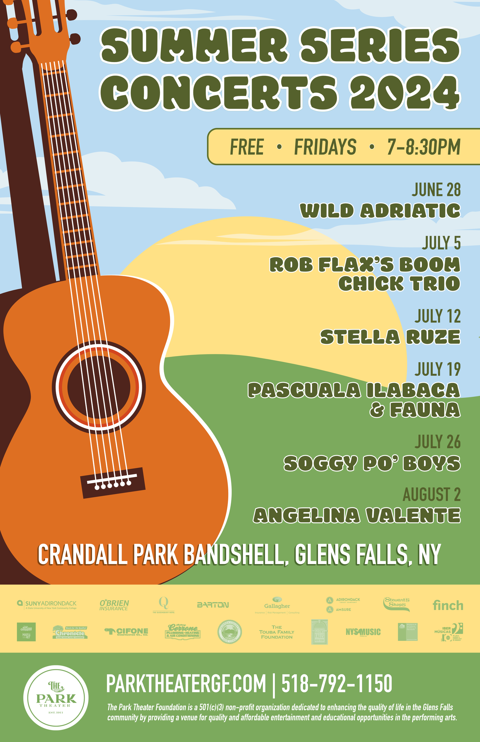 The Park Theater Foundation would like to recognize the support of the City of Glens Falls, as well as their series sponsors SUNY Adirondack, The Queensbury Hotel, O’Brien Insurance, Adirondack Trust Co., Amsure Insurance, Barton International, Gallagher Insurance, Stewart’s Shops, Finch Paper, Cifone Construction Co., Cerrone Plumbing, Heating & Air Conditioning, Price Chopper/Market32, Glens Falls Chronicle, The Touba Family Foundation, Iber Exchange and NYS Music.