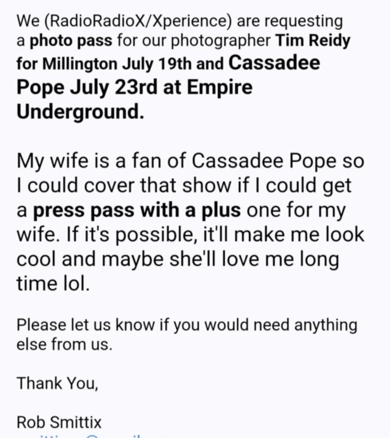 So here’s the deal folks, as our commander in chief would say… I originally wasn’t trying to go to this show to be honest. And that’s me just being the music snob that I am. I remember the name Cassadee Pope from The Voice and I thought she was a pop-country artist. I’m not into pop-country but my wife (Laurie) sure loves that shit and she wanted to go. So I sent my contact at Empire as message that read: “We (RadioRadioX/Xperience) are requesting a photo pass for our photographer Tim Reidy for Cassadee Pope July 23rd at Empire Underground. My wife is a fan of Cassadee Pope, so I could cover that show if I could get a press pass with a plus one for my wife. If it’s possible, it’ll make me look cool and maybe she’ll love me long time lol.”