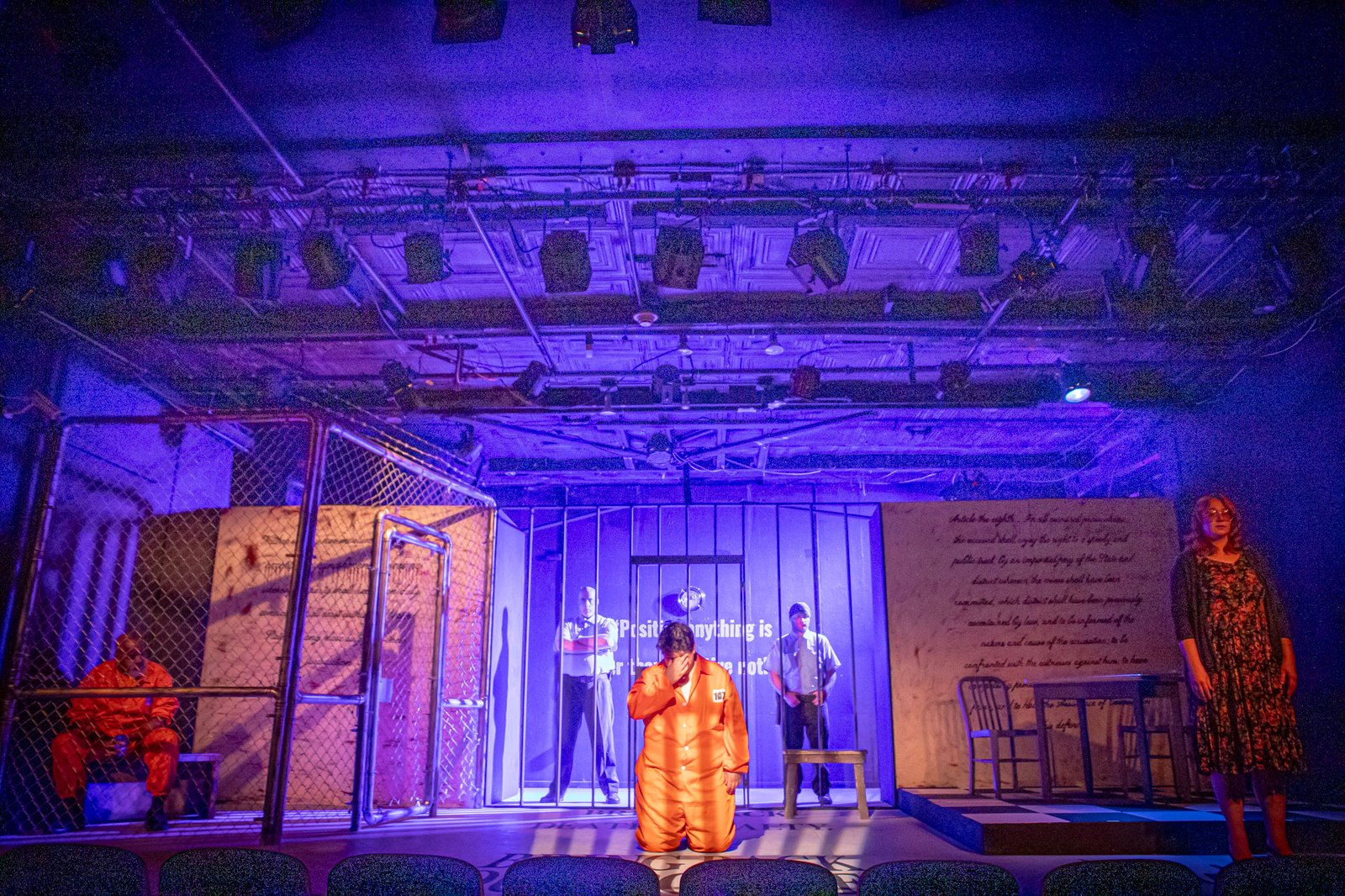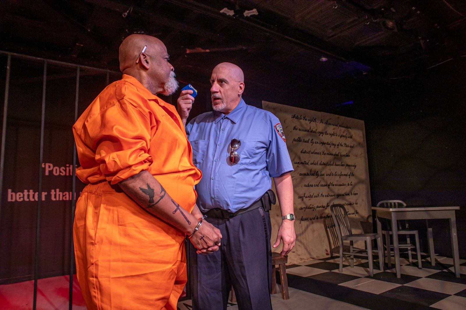 David Zwierankin’s spare set gives you a taste of how brutal Rikers can be. The cage Moore spends most of his time in has barbed wire at the top, and bloodstains splatter the 14th Amendment written on the wall; the 8th Amendment is written on the wall of the interview area on the opposite side of the stage. (The saying on the set’s back wall actually appears on a wall at Rikers.) Combined with Laura Darling’s elegant lighting design and Brian Starnes’ knockout sound design, Evan Jones has a well-prepared canvas with which to paint Guirgis’ all-too-human characters in vivid, heartbreaking colors.
