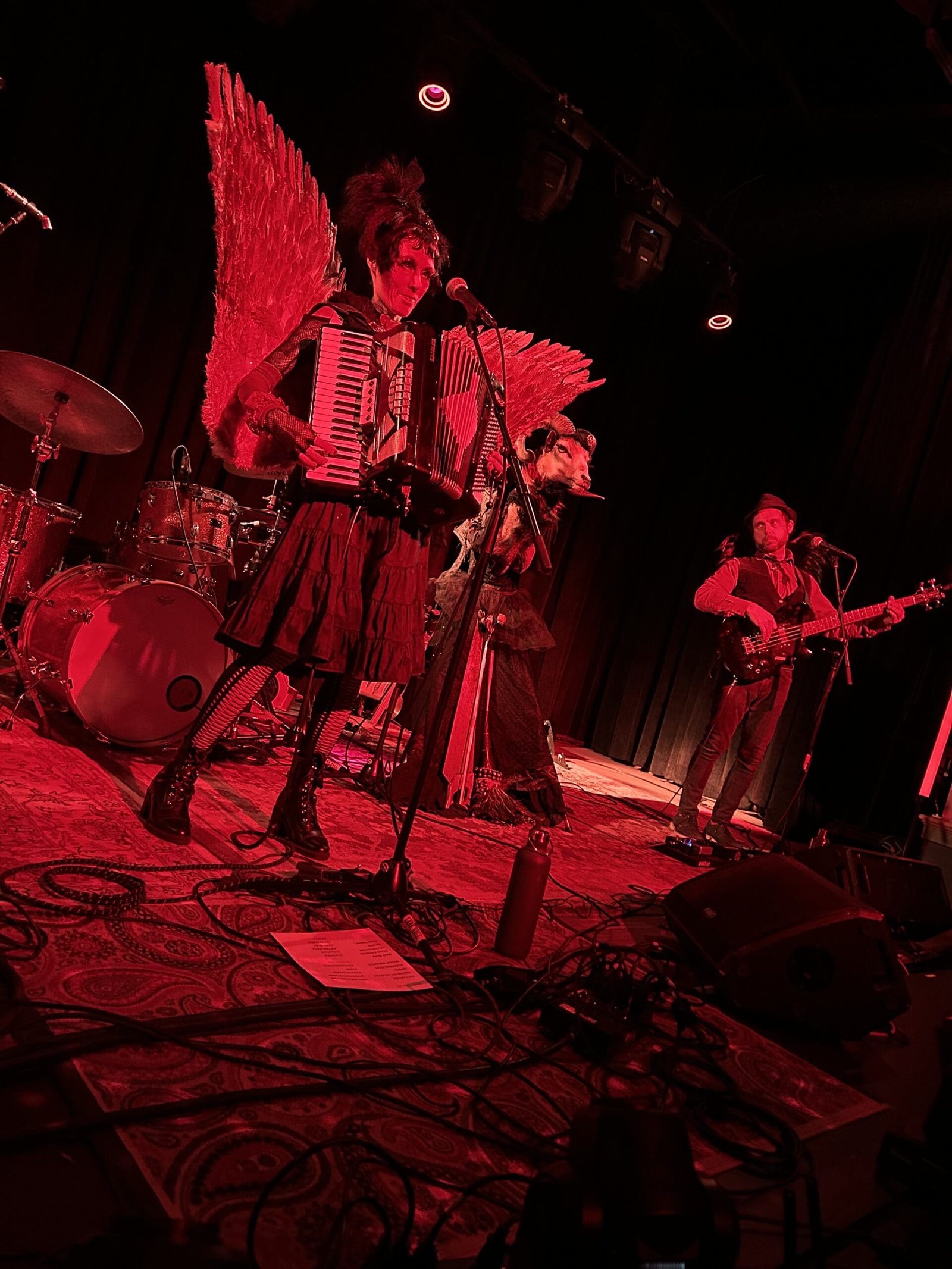 Less than 5 minutes later she appeared on stage, joined at the neck to her spirit animal, Hazel, the taxidermy goat. Immediately setting the stage for backwoods Gothic weirdness, Cooley open the show with the evocative sound of a bow being dragged across a musical saw. She quickly shed the husk of Hazel for her second signature spiritual signifier, her wings; and morphed into the dark angel of black velvet draped cemetery music that we’ve all come to know. But it is her sharp diction and precise phrasing that makes Dust Bowl Fairies a transformative experience. Employing the weird, treacly voice of a little girl telling a horror story to her dolls, Ryder plays it straight, not kitsch. She uses her voice like a cast of actors and actresses, shifting modes and emotions, complimenting the creepy, hurdy, gurdy sound of her accordion playing. Like Morticia Adams, you wouldn’t be surprised to see her cut the head off of a Barbie doll to improve it.