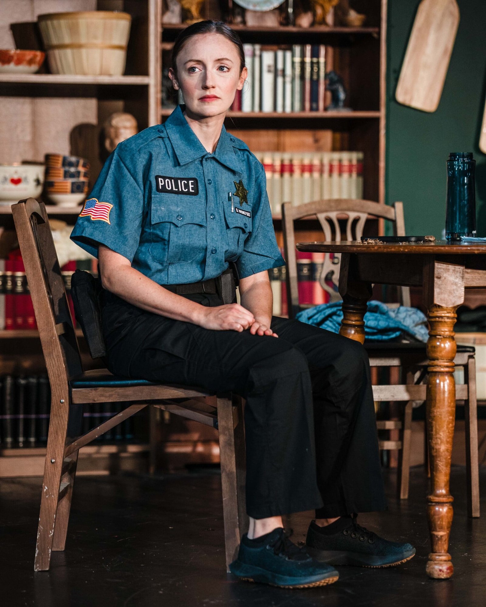 Lisa Bryk, as Sheriff Kris, is a standout — funny, forceful, and utterly transparent in a way that is both entertaining and disarming. Bryk plays Kris as someone who always reveals exactly what she’s thinking, and that forthrightness becomes one of the production’s most compelling dynamics. She moves between humor, authority, and a touch of menace with precision, giving the character sharp edges without losing her humanity. It’s a nuanced performance that energizes every scene she enters.
